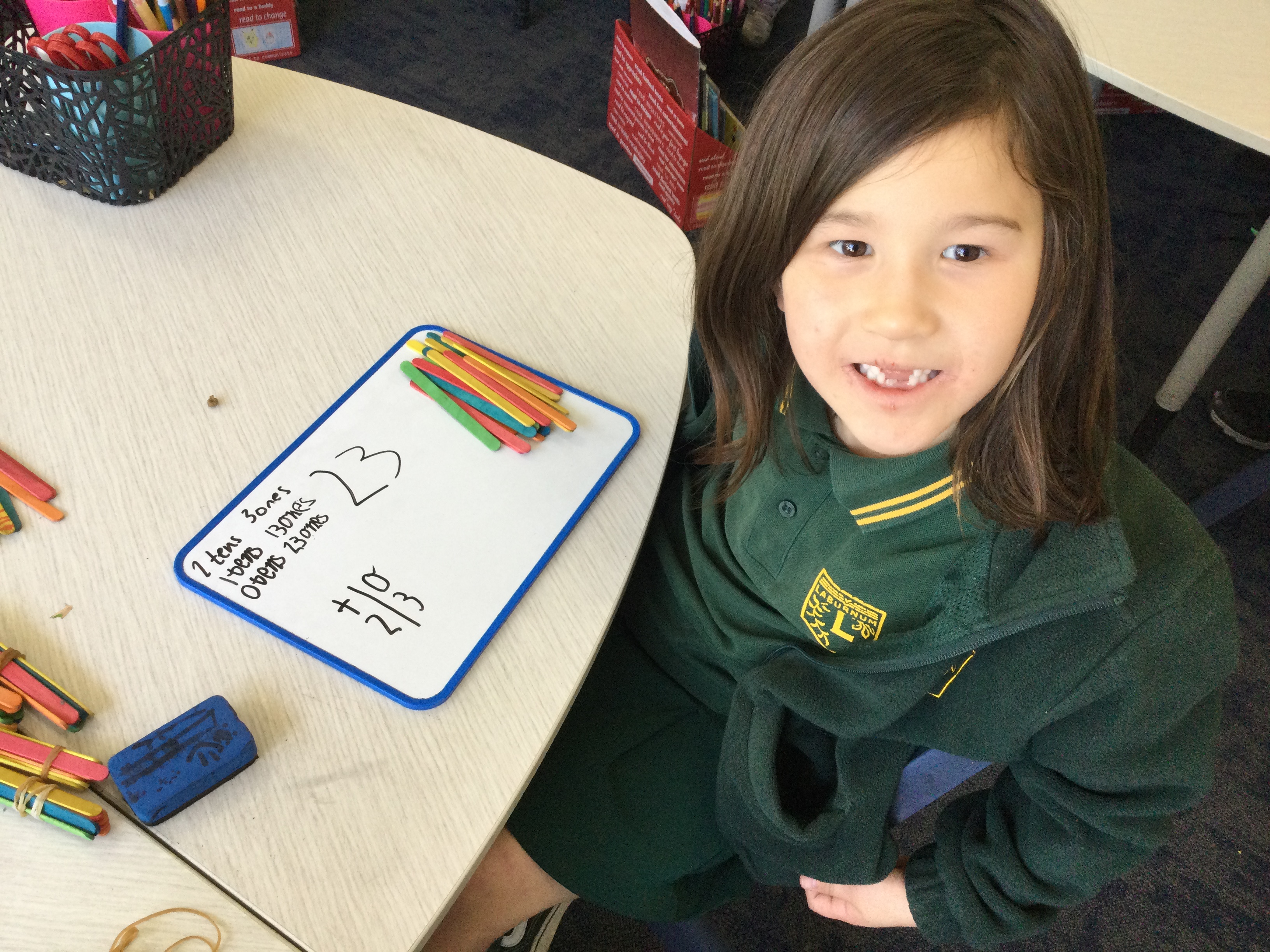 Last term, we partitioned numbers into tens and ones. We call this standard partitioning. But this term, we stepped up a level. We have been partitioning numbers in new, and sometimes tricky, ways. We know that 20 and 3 make 23 but so does 10 and 13. And even more tricky than that, we also know that 23 can be partitioned into three parts! For example, 10 and 10 and 3. Wow! Luckily, we have been using our bundling sticks to help us understand this process.