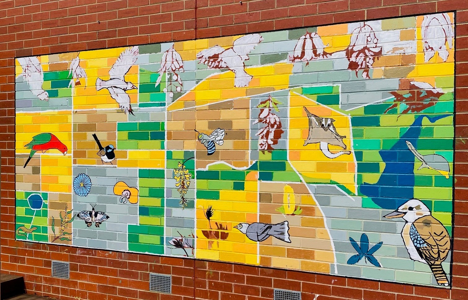 The 2025 Graduation project is coming along as students take turns working in groups. They are working closely with Santosh and referencing photographs for detail. The bricks are thoroughly covered now, with bright colours and striking images of familiar flora and fauna. Stay tuned for the finished work coming soon.