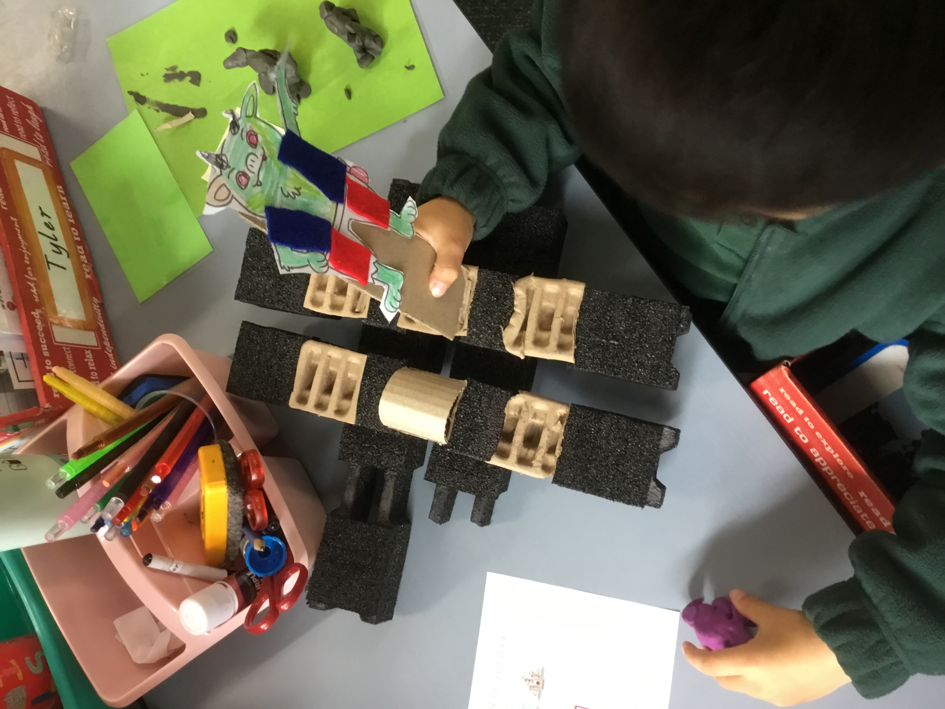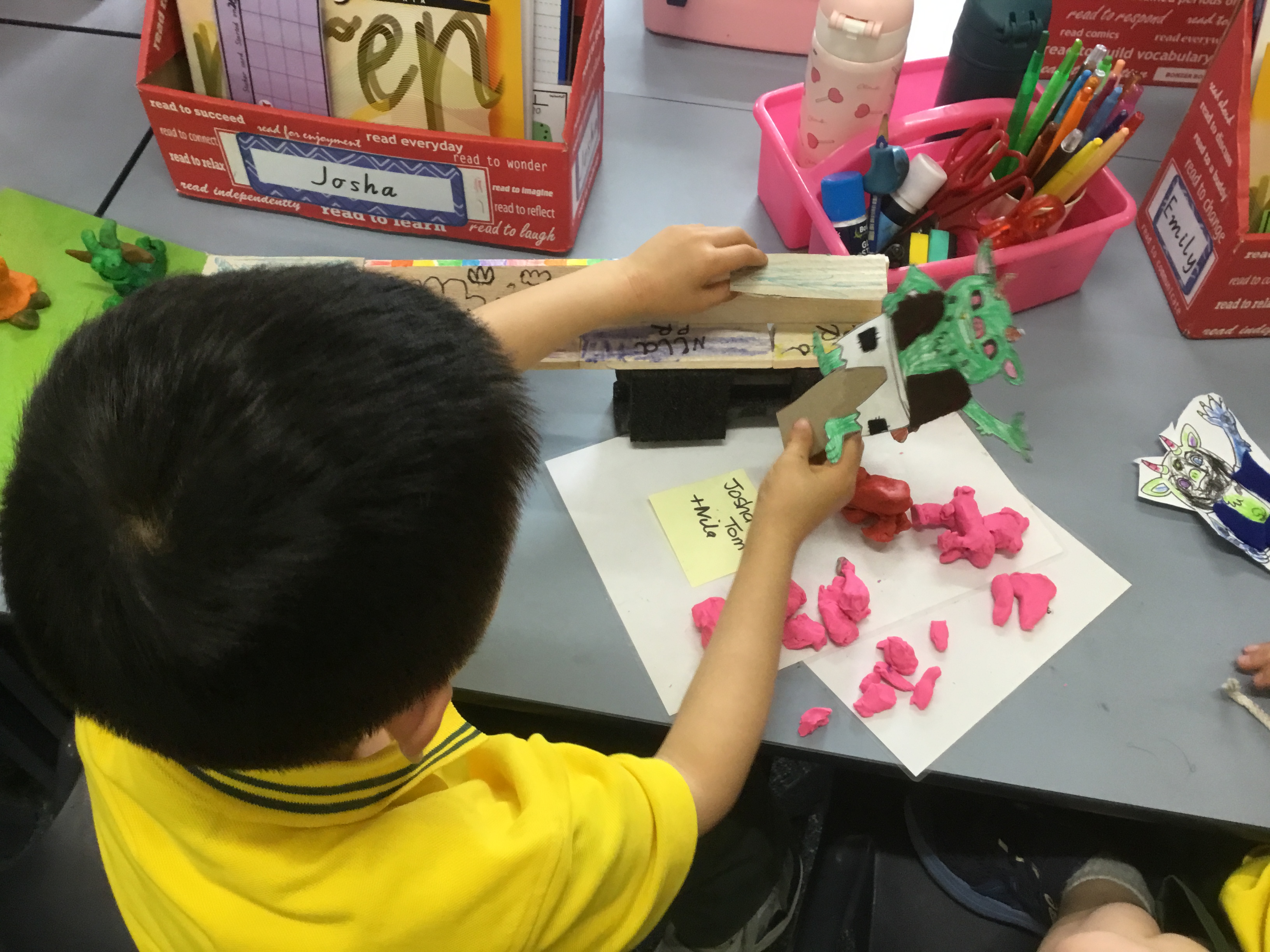 In Art lessons with Ms Farlow, we investigated which material would be the best for building a strong bridge. We tried paper first, but it was too weak and bent easily. Then we tried clay and wood, but that was too crumbly. After that we experimented with cardboard, which was much stronger, and it was sturdy enough for the goats to cross.