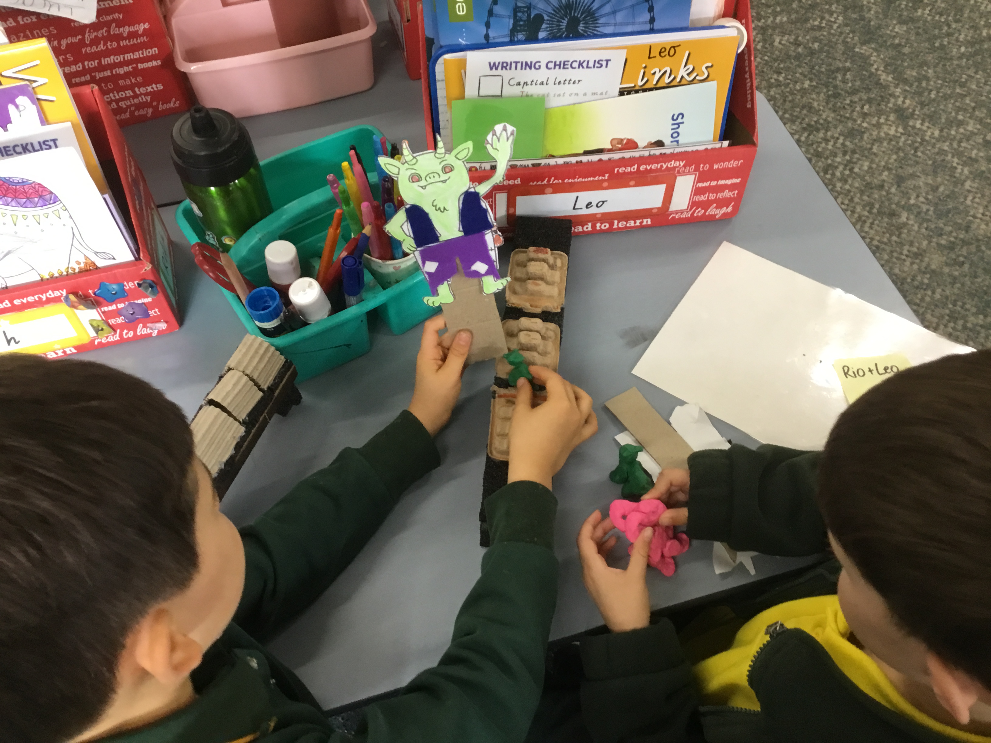 We looked at the story ‘The Billy Goats Gruff’ and created the characters and a bridge using a variety of materials. The billy goats were made from plasticine, the troll’s clothing from felt fabric, and the bridges were constructed using cardboard and other craft materials, such as wooden sticks and recycled boxes.