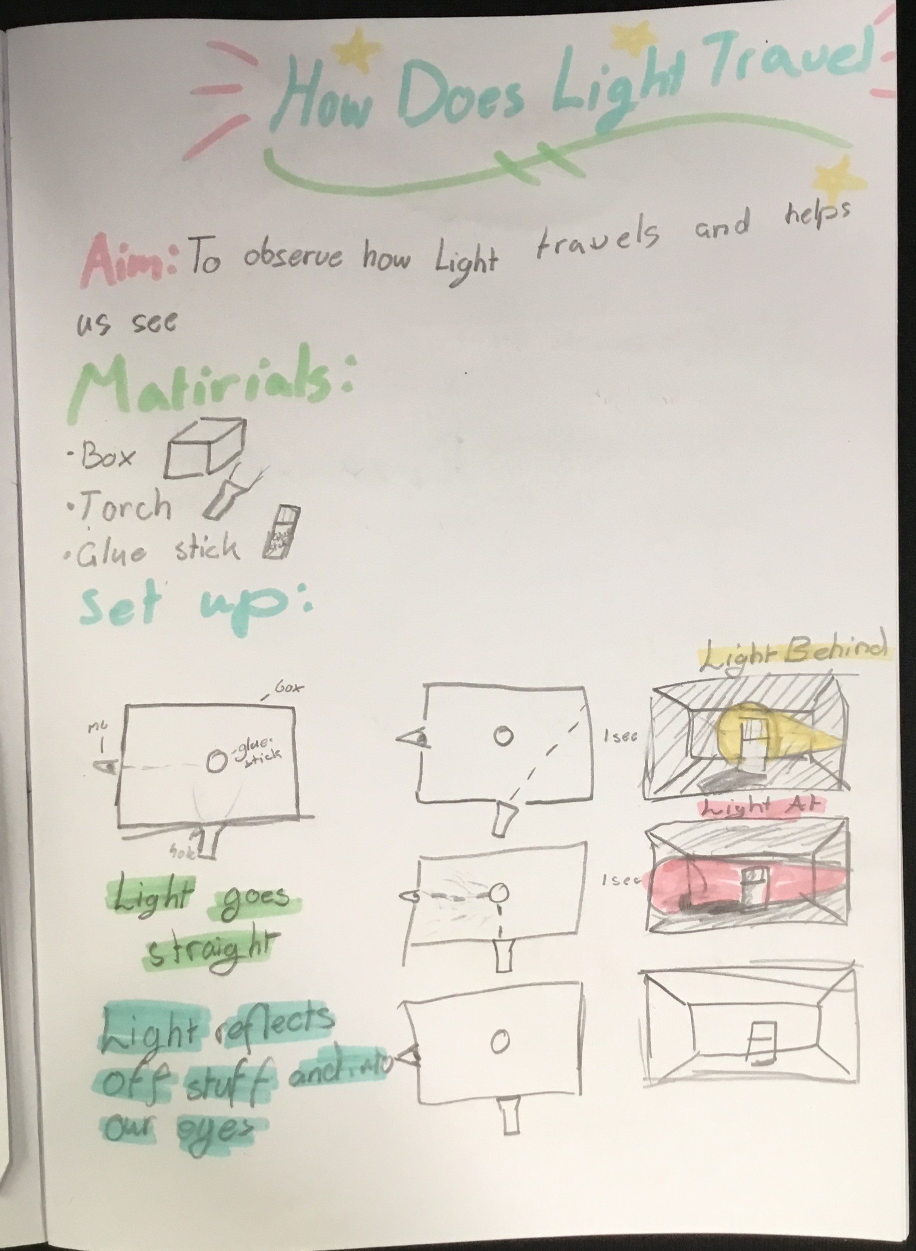 Our Science Unit this term is Light and students have enjoyed participating in the many experiments that have taught us how light travels in straight lines, reflects off surfaces, and creates shadows. Throughout the unit, students have explored how mirrors can change the direction of light and drew simple ray diagrams to show its path. We have also investigated how different colours of light combine, building an understanding of how white light is formed.