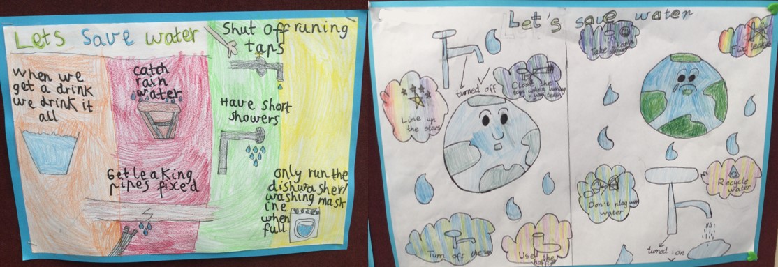After learning about the importance of water, students created Water Saving posters, listing all of the different ways to save water in our community.