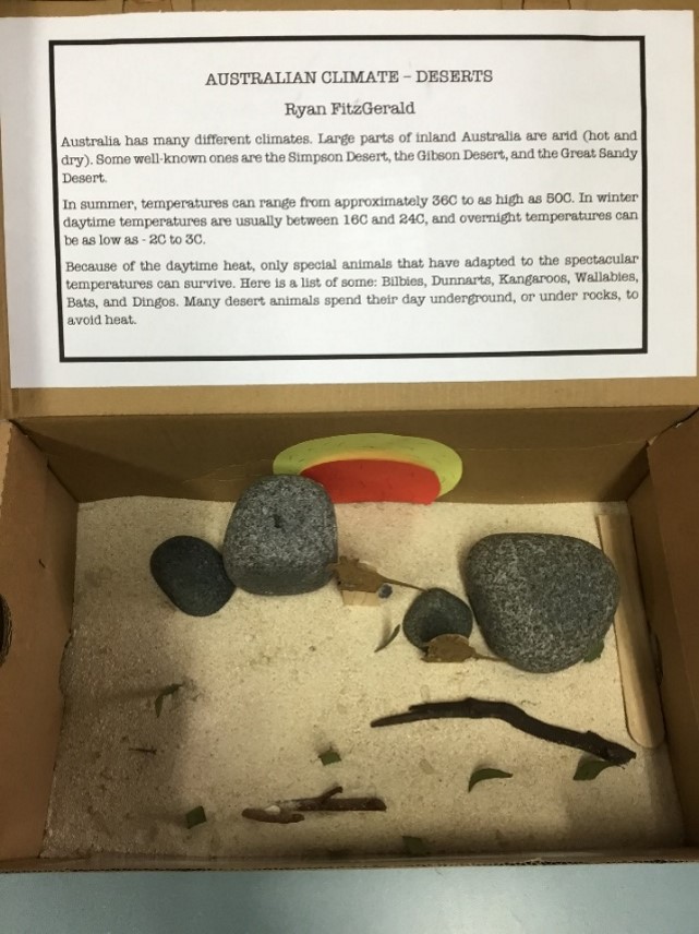 During Term 3, students have been learning about the different climate zones within Australia and how the environment supports living things. Students researched an area of interest and chose how this would be presented, producing amazing dioramas, posters, booklets and PowerPoint presentations.