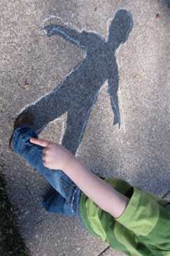 The following images show someone tracing their toys and then their whole body, in chalk on the pavement.