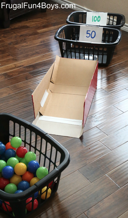 You will need: Empty cereal boxes, laundry baskets, scissors and soft plastic balls