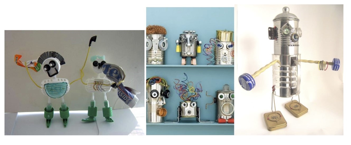 Packaging: moulded cardboard, bubble wrap, clear plastic sheeting, small boxes, bread ties, wire, disposable cutlery, egg cartons, biscuit trays, disposable cups and lids, broken toys, clean tins, old buttons, broken clothes pegs, broken machinery, tapes and CDs.