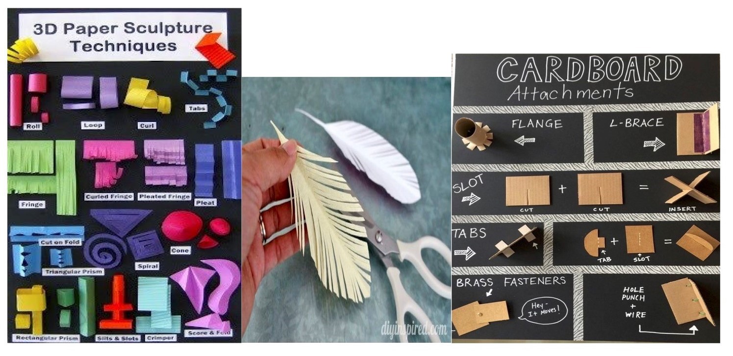 Packaging: moulded cardboard, small boxes, egg cartons, disposable cups and lids, sticks and leaves from outside, feathers, old magazines for cutting out patterns and images.