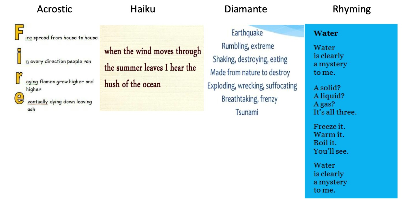 Diamante - an unrhymed seven line poem in a diamond shape.