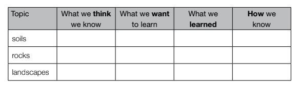 Think about what you already know and what you want to learn about soils, rocks and landscapes.