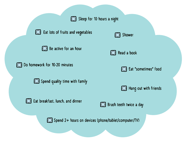 Watch this ClickView video about 'Healthy Habits' and think about what you would like to include in your personal weekly timetable. Below are some examples:
