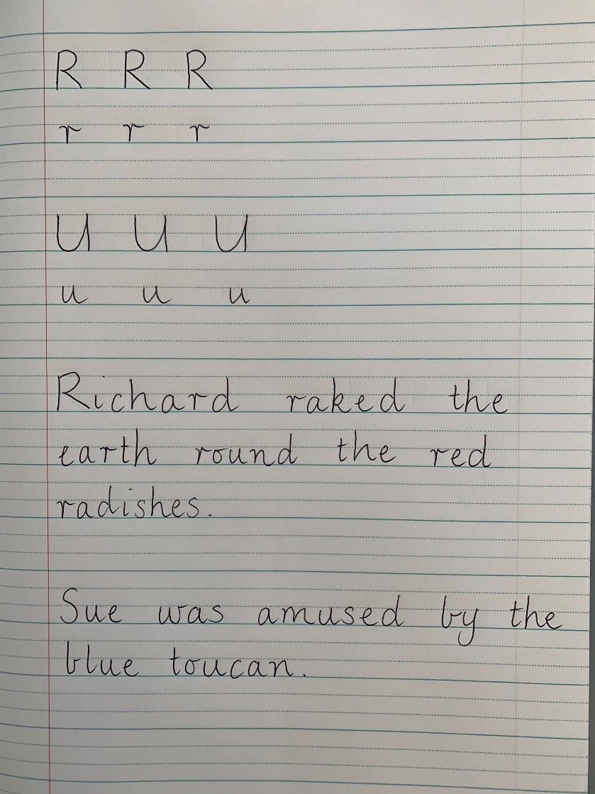Copy and continue the handwriting into your lined book. Remember to use correct posture and pencil grip. You could also create your own sentences using words with r and u.