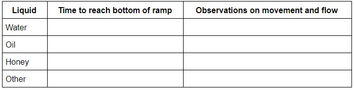You will conduct an experiment to compare water, vegetable oil, and honey. You will obtain the same amount of each liquid and then let them run, one at a time, down a ramp, or incline. As a challenge, you may choose to include other liquids to compare, but check with your parents first, as some liquids found in your home may stain or be dangerous.