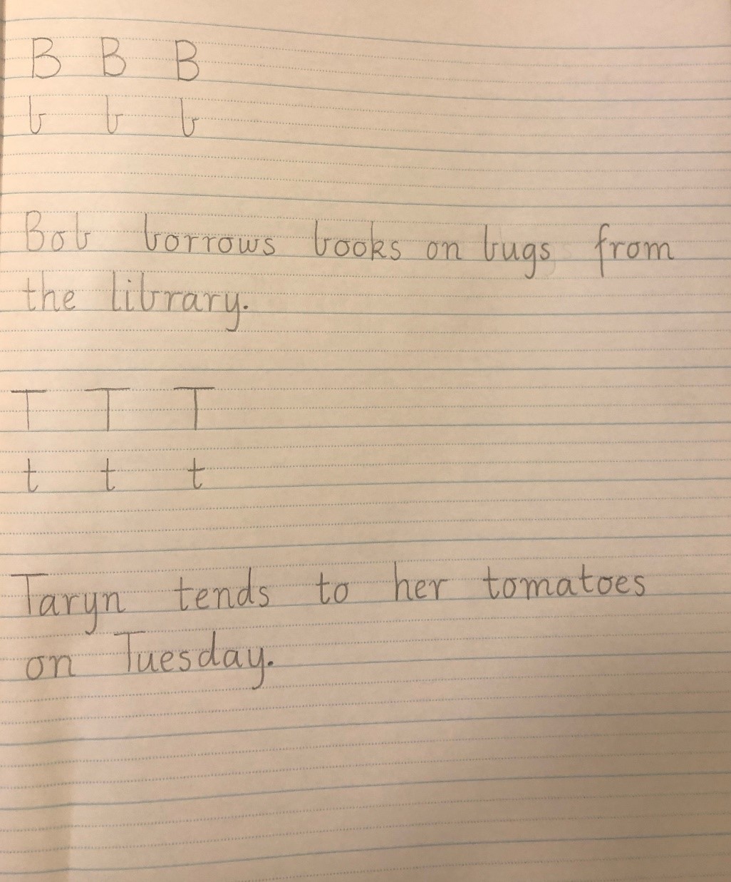 Did you notice something about the lower-case t? It doesn't start on a dotted line - tricky!
