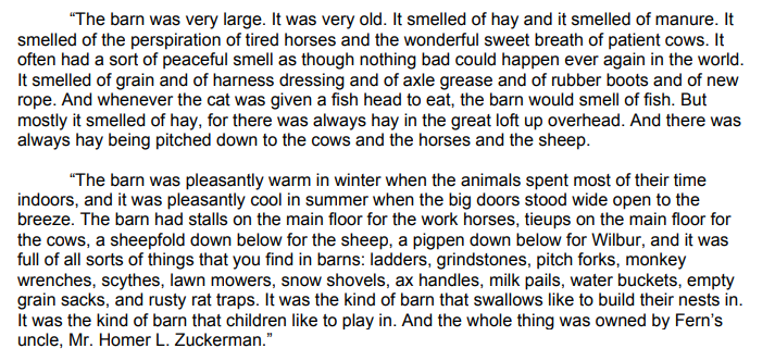 Pay attention to all of the descriptive language in the text to help you figure out the size of the barn, the colours and the animals that live there.