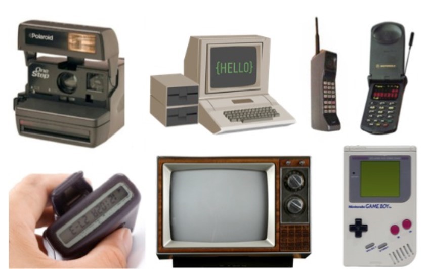 Here are some possible ideas; pager, camera, old phone, typewriter, tapes, CDs, VHS, floppy disc, small machines, answering machine, 33/45 record or other technology items.